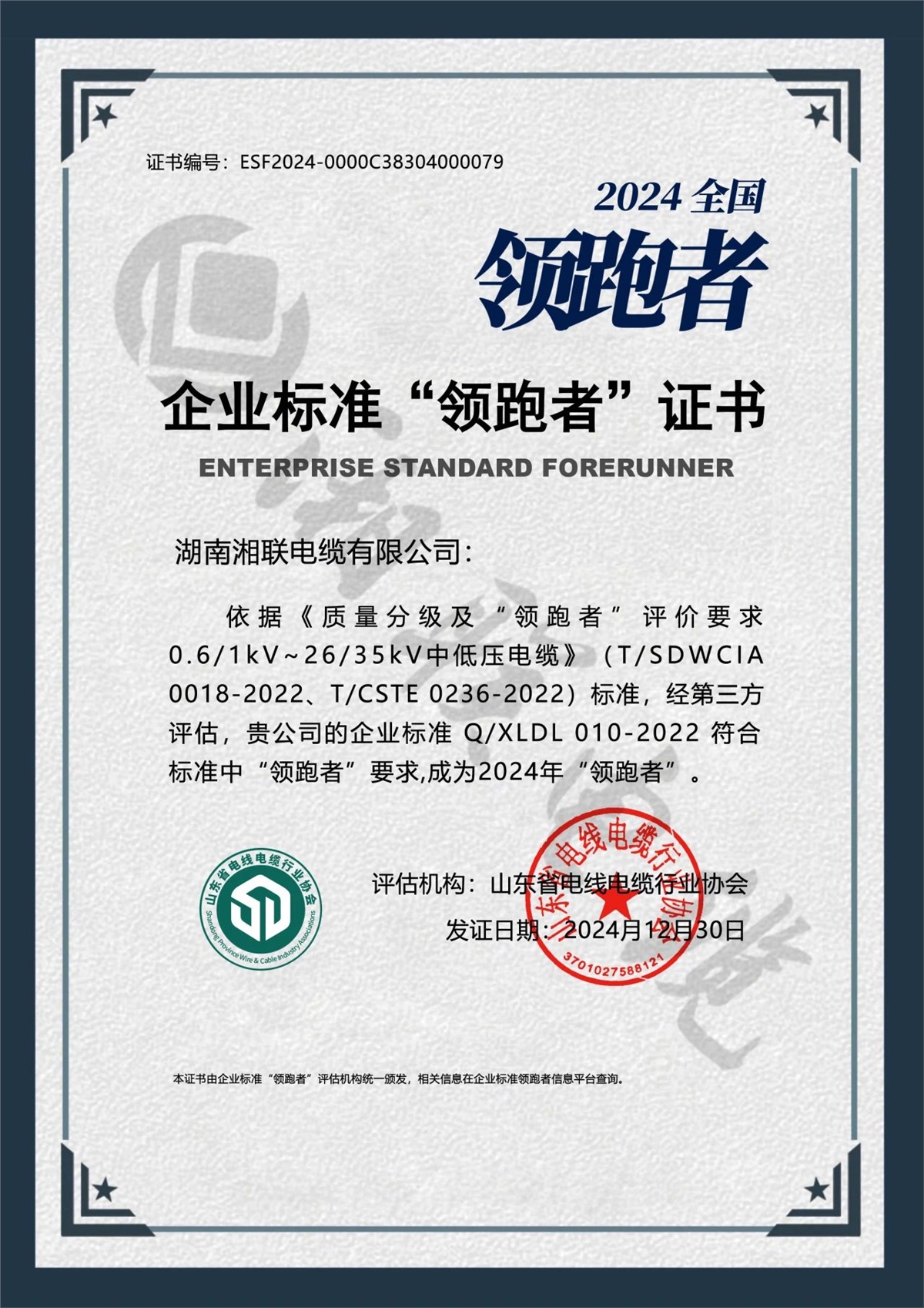 近日,2024年度企業(yè)標(biāo)準(zhǔn)“領(lǐng)跑者”名單發(fā)布,湘聯(lián)電纜Q/XLDL010-2022、Q/XLDL018-2023、Q/XLDL016-2022三項(xiàng)企業(yè)標(biāo)準(zhǔn)榮獲2024年企業(yè)標(biāo)準(zhǔn)領(lǐng)跑者,這也是湘聯(lián)電纜連續(xù)第三年獲此殊榮。